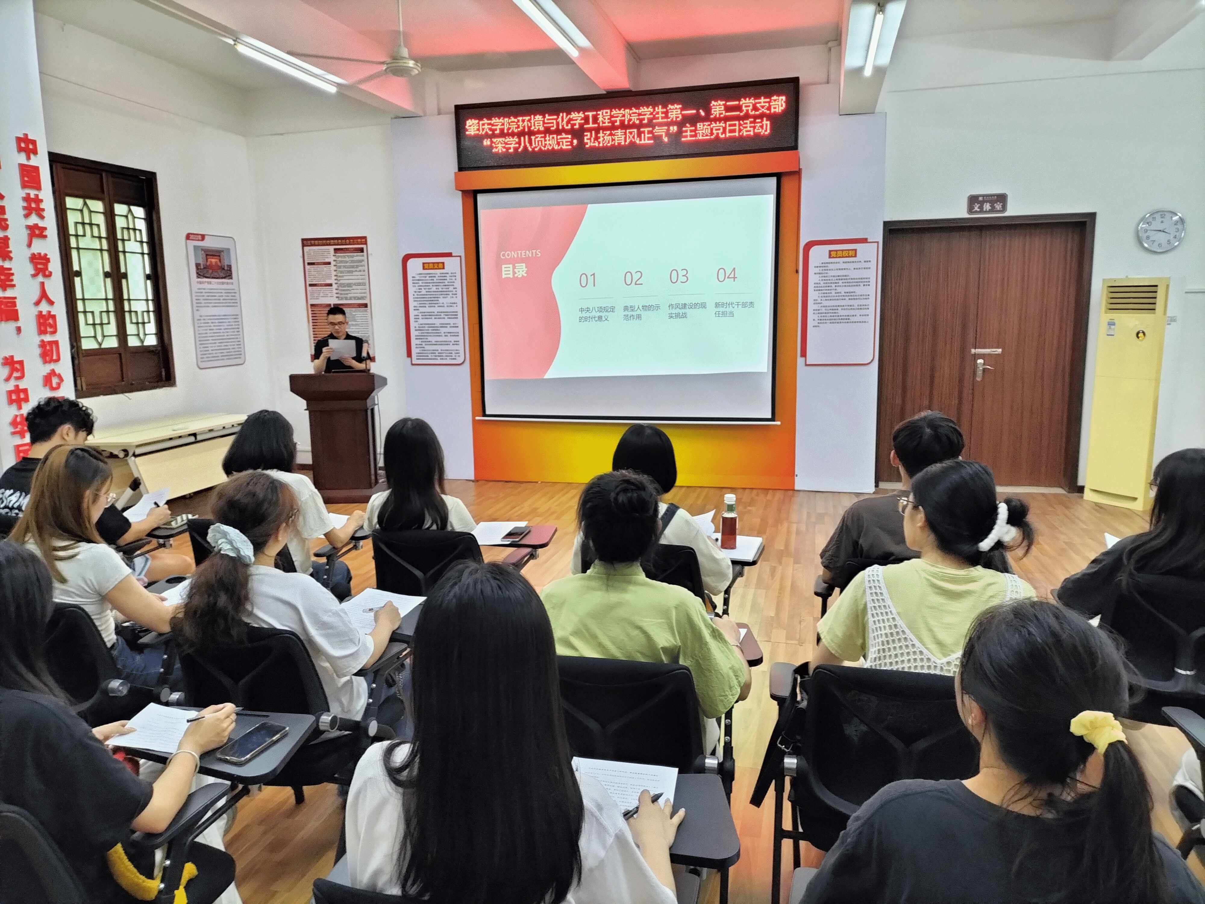活动中,两位党支部书记在包公学堂分别讲授专题党课。员工第一党支部书记师伟展以“汲取灯盏力量,深学八项规定”为题,结合叶连平的廉洁事迹,深入阐述了八项规定的重要意义和实践要求,号召全体党员筑牢思想防线。