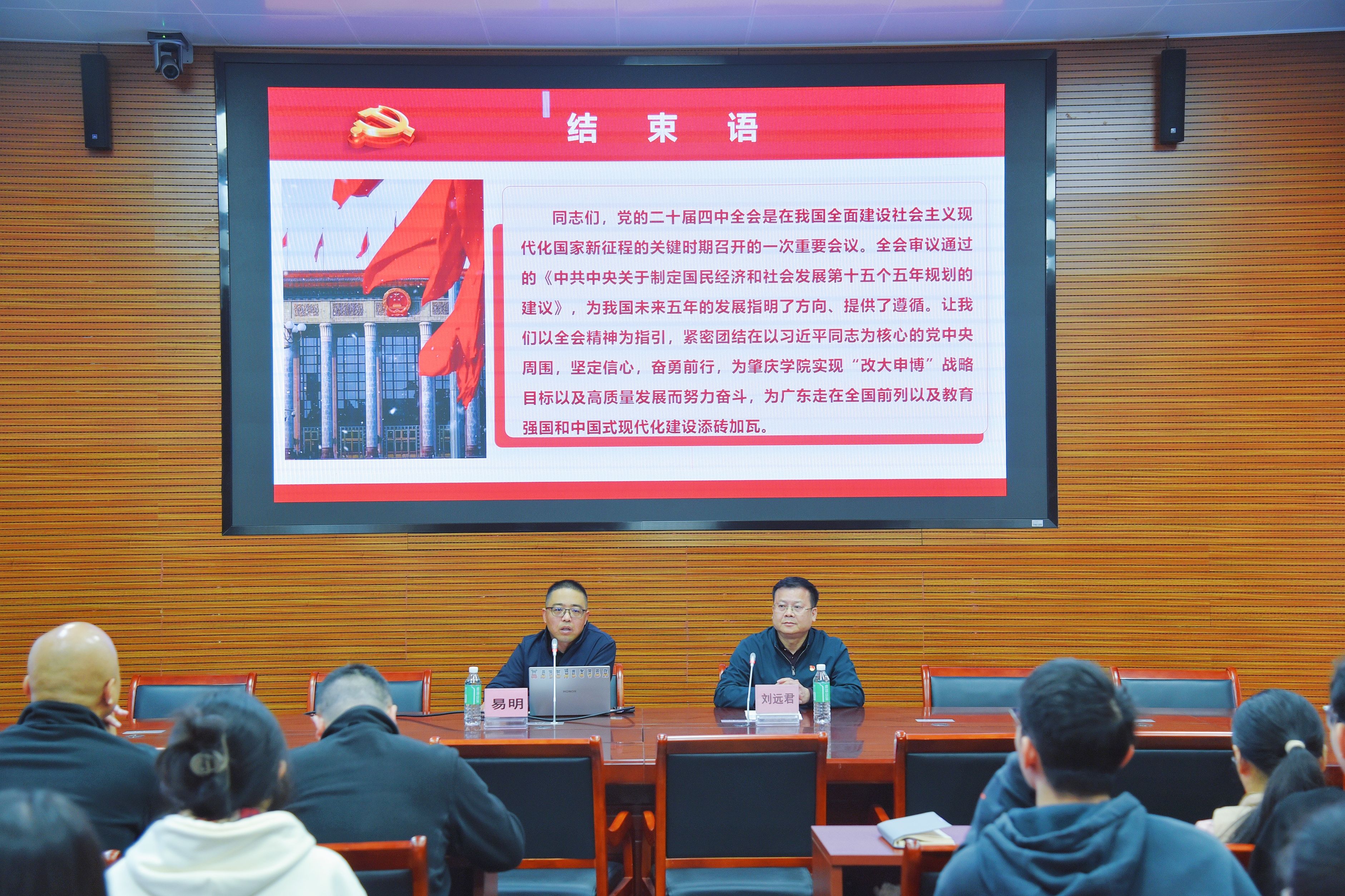 为深入学习贯彻党的二十届四中全会精神,准确把握“十五五”时期发展目标与战略任务,进一步统一思想、凝聚合力,2025年12月9日,bevictor伟德官网在实训楼112室举行“学习贯彻党的二十届四中全会精神暨‘十五五’规划解读”专题宣讲会。会议邀请马克思主义公司博士易明副教授担任主讲,公司党委书记刘远君主持,公司师生党员代表共同参加。