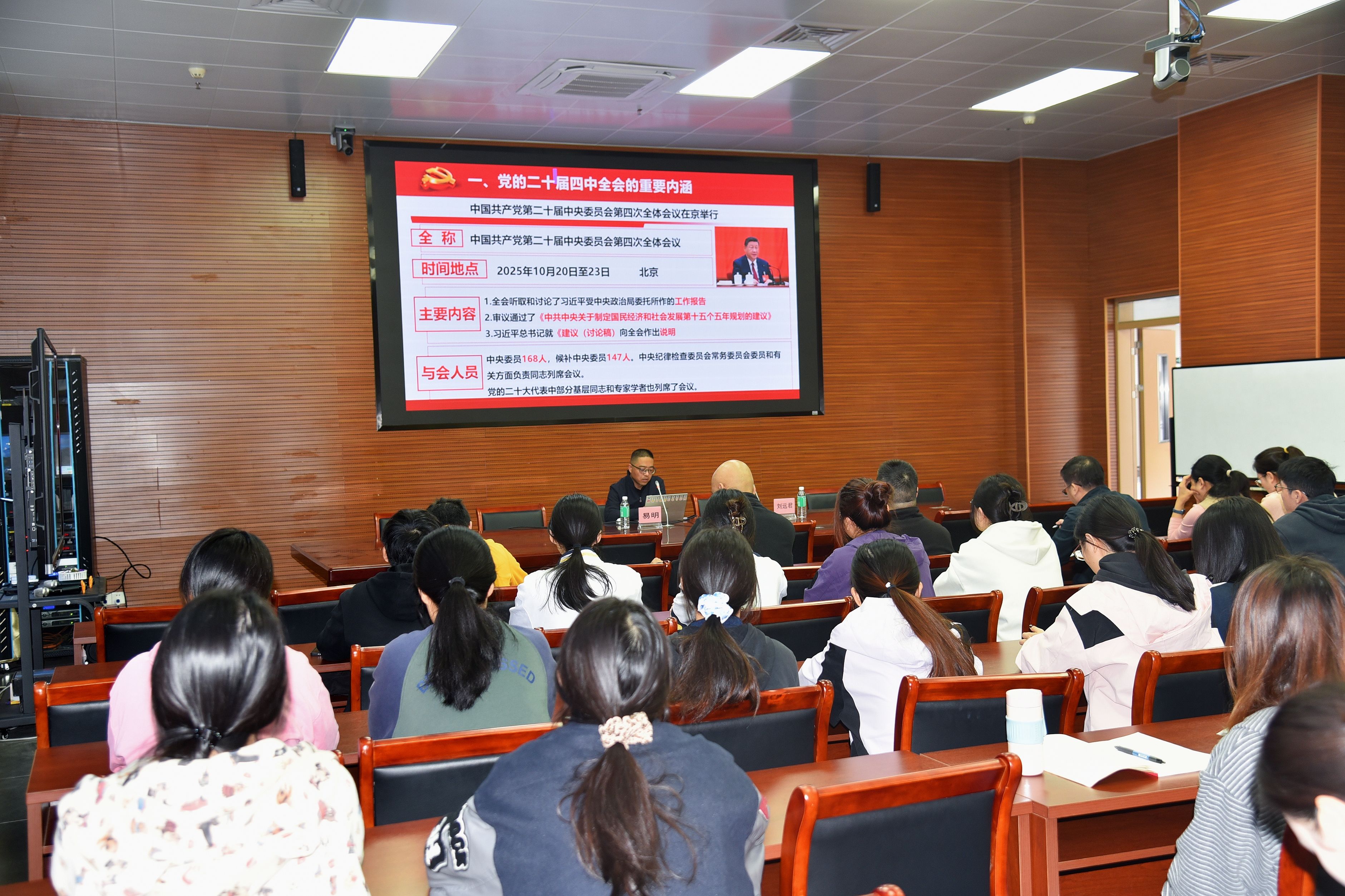 宣讲会以“学精神、明方向、促实干”为主题,易明通过系统梳理、案例结合、远景展望等方式,从五个维度展开深入解读:一是深刻阐述党的二十届四中全会召开的时代背景、重大议程与深远意义,强调全会围绕“以中国式现代化全面推进强国建设、民族复兴伟业”提出的明确要求;二是通过详实数据与生动实例,全面回顾“十四五”期间我国在经济发展、科技创新、民生改善等方面取得的历史性成就,增强发展信心;三是聚焦“十五五”规划编制的指导思想、战略目标与重点任务,深入解读“新质生产力培育”“共同富裕扎实推进”“绿色低碳转型”等关键部署,阐明规划实施的现实路径;四是系统展望“十五五”时期经济社会发展的宏伟蓝图,引导师生深刻领会国家中长期发展的战略导向;五是结合高校使命与公司实际,从“强化理论武装”“融入育人实践”“推动宣传阐释”三个方面,对如何将全会精神转化为推动工作的具体行动提出务实建议。