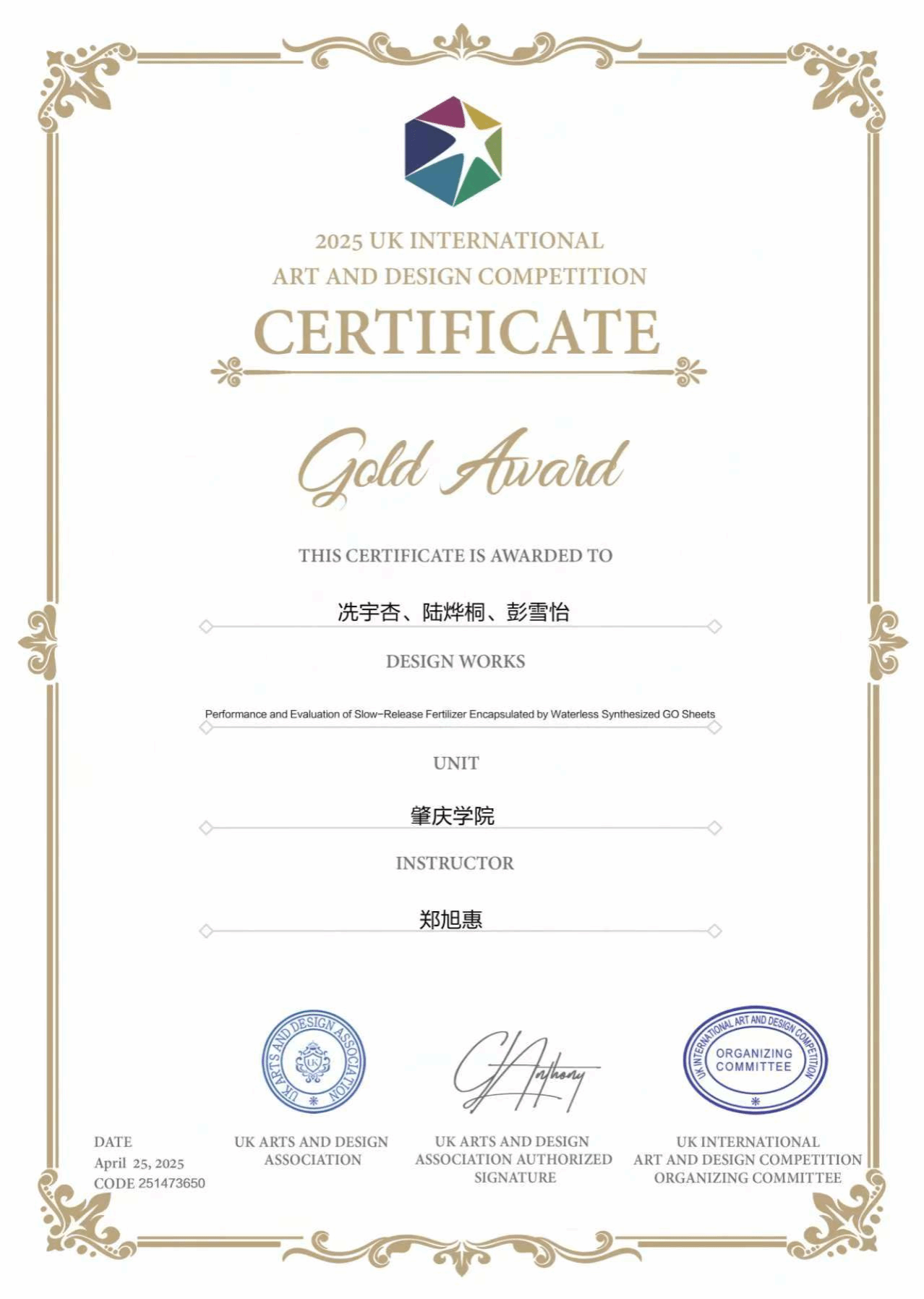 近日,由英国艺术设计协会(UK-AADA)主办的2025英国国际艺术设计大赛全球评审结果正式揭晓。bevictor伟德官网郑旭惠老师指导的参赛作品,赢得国际评审委员会高度赞誉,最终斩获:金奖、铜奖、优秀奖各1项,郑旭惠获评优秀指导教师。
