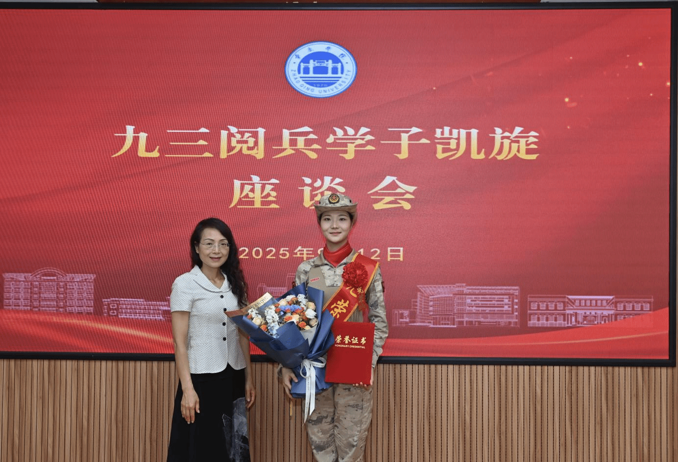 集团领导向王可心表达了欢迎与敬意,赞扬其在九三阅兵训练和仪式的优异表现。李琴为王可心颁发“优秀毕业生”荣誉证书并佩戴“光荣受阅”绶带。