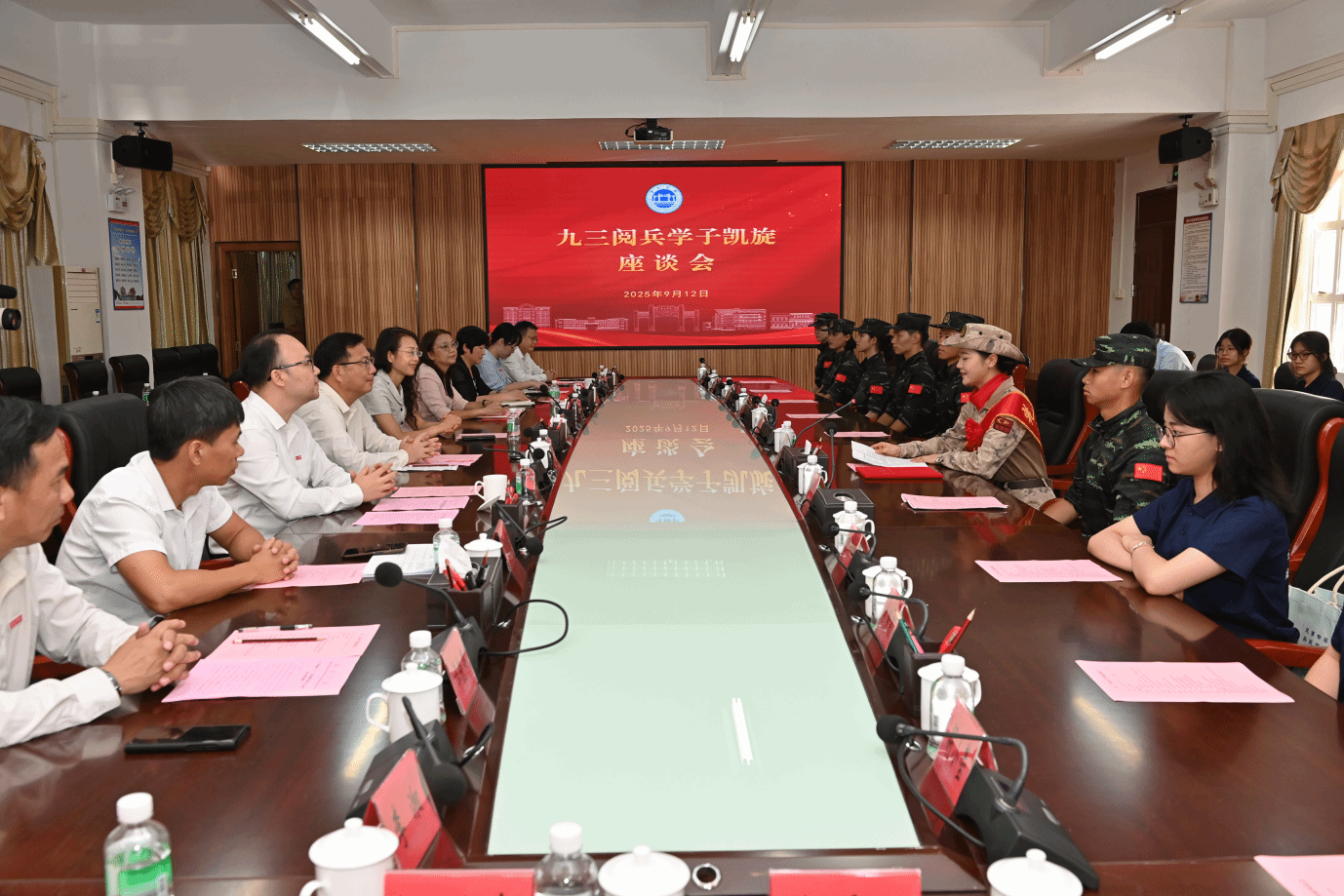 9月12日,公司召开九三阅兵学子座谈会,欢迎2025届化妆品技术与工程专业优秀参阅学子王可心荣誉归来。公司党委书记谢冠华,董事长李琴,公司相关职能部门负责人,公司党委书记刘远君、经理李湘等班子成员、辅导员及新生军训教官和青马工程学员代表参会。