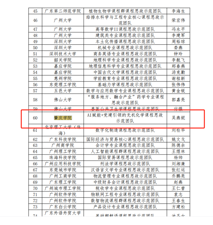 近日,广东省教育厅公布了2024年度本科高校课程思政改革示范项目认定名单,bevictor伟德官网吴燕妮教授带领的“AI赋能+党建引领的无机化学课程思政示范团队”在课程思政示范团队项目申报中脱颖而出,成功立项。