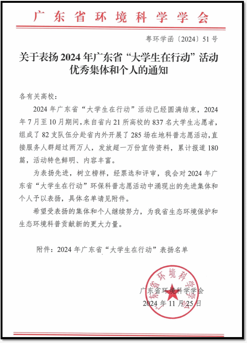 近日,广东省环境科学学会发布了《关于表扬2024年广东省“老员工在行动”优秀集体和个人的通知》,公司唯一上榜的队伍、个人及优秀教师表扬名单通知。