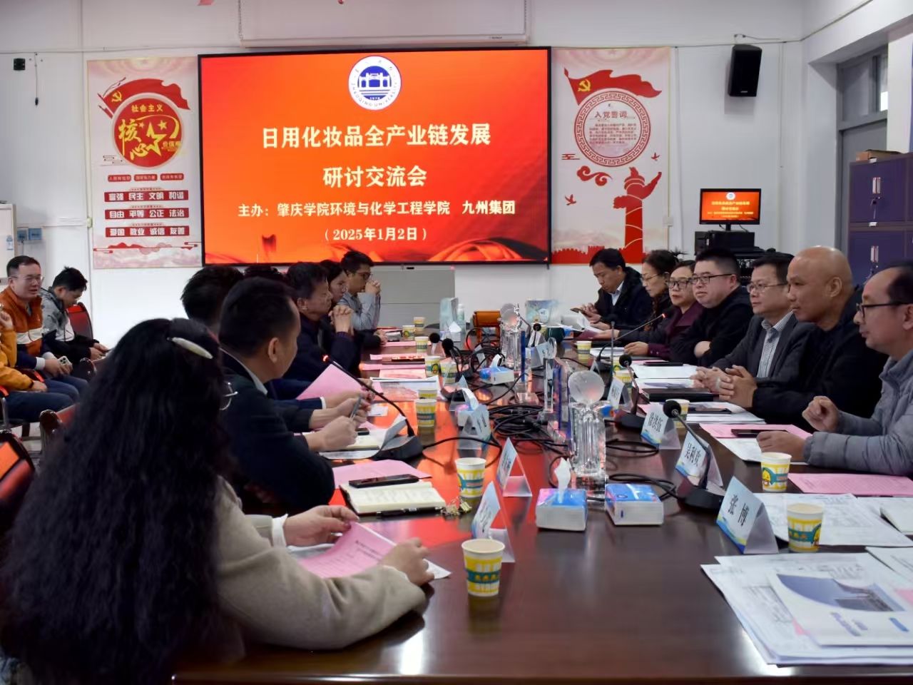 2025年1月2日,2025年的第一个工作日,公司与九州集团开展关于日用化妆品全产业链发展研讨会。研讨会以九州集团投资的德庆县美景日化美妆产业园为基础,对日用化妆品研发生产、外观设计、污水处理以及产学研合作等环节进行深入探讨,达成合作共识。