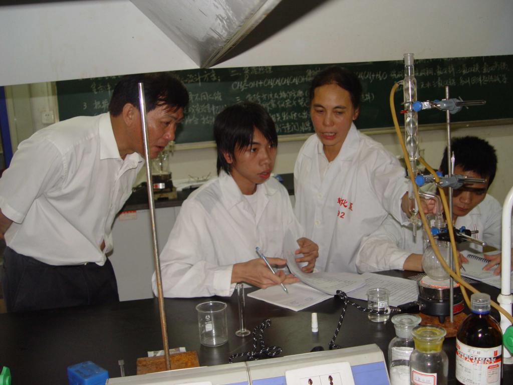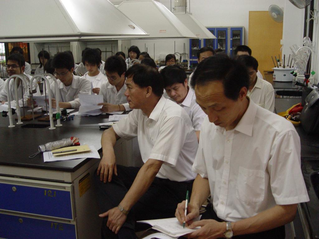 和飞董事长、周苏平副董事长在认真观看同学们实验操作
