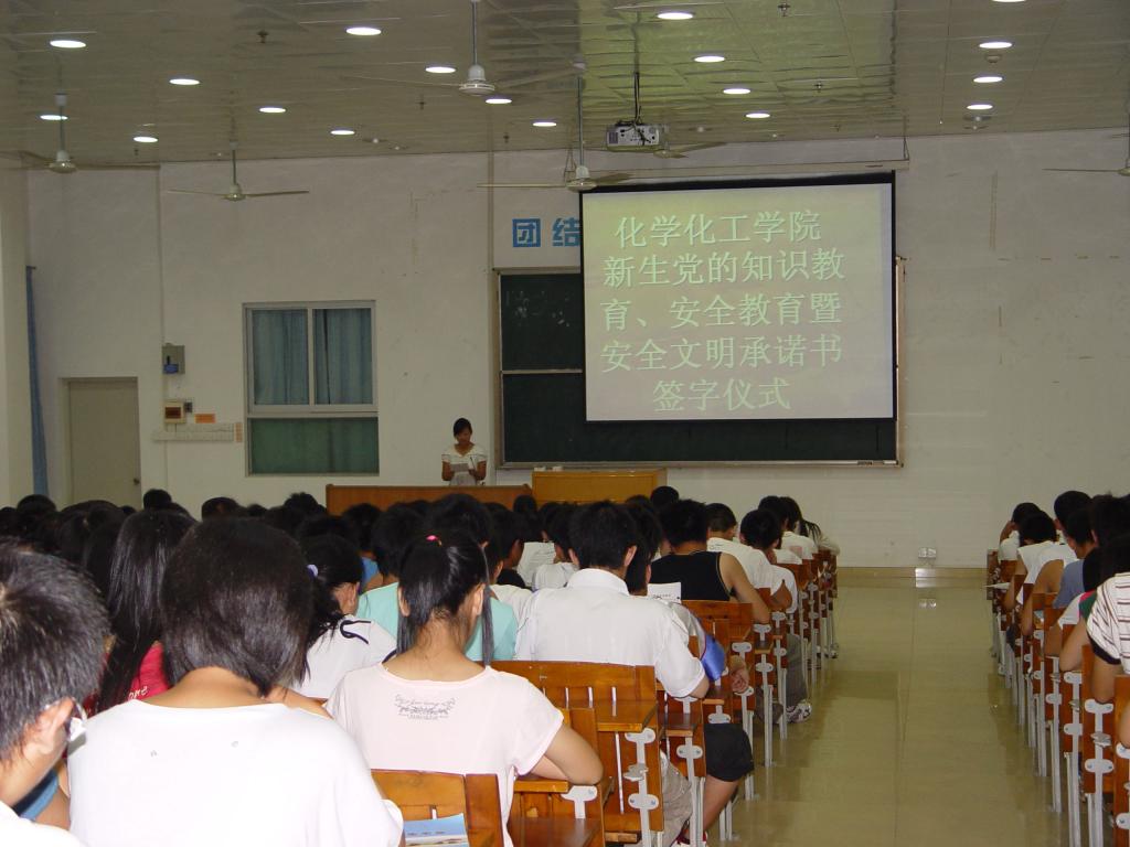 9月12日晚,化学化工公司开展了新生党的知识教育、安全教育暨安全文明承诺书签字仪式。在辅导员胥家桢老师主持下,08届新生在文明承诺书上签下了自己的名字,并由郑少丽师姐将文明承诺书递交给员工处的卢咏科长。之后由陈玉华老师分别给新生们讲解了老员工适应教育以及党的知识教育,包括党史及如何入党等内容,同学们都十分认真地倾听,并不时记下老师所讲的内容。最后胥家桢老师为同学们讲解了新生安全教育,用实实在在的事例给同学们敲响警钟,并给同学们提出了许多日常生活中的安全建议。