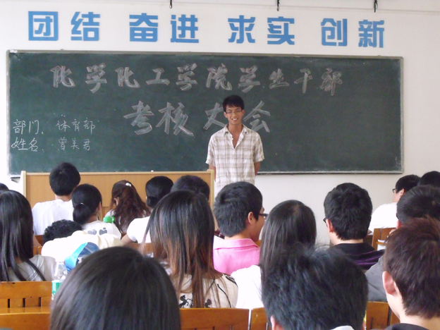 考核主要从仪表形象、语言表达能力、想象、创新能力和工作态度四个方面对员工干部进行民主测评。各部委按照顺序依次上台进行工作述职演讲,总结一年来员工员工干部的工作和所收获的经验,并提出存在的问题和解决方案、建议。部委自信的表现赢得了在场评委和观众雷鸣般的掌声。