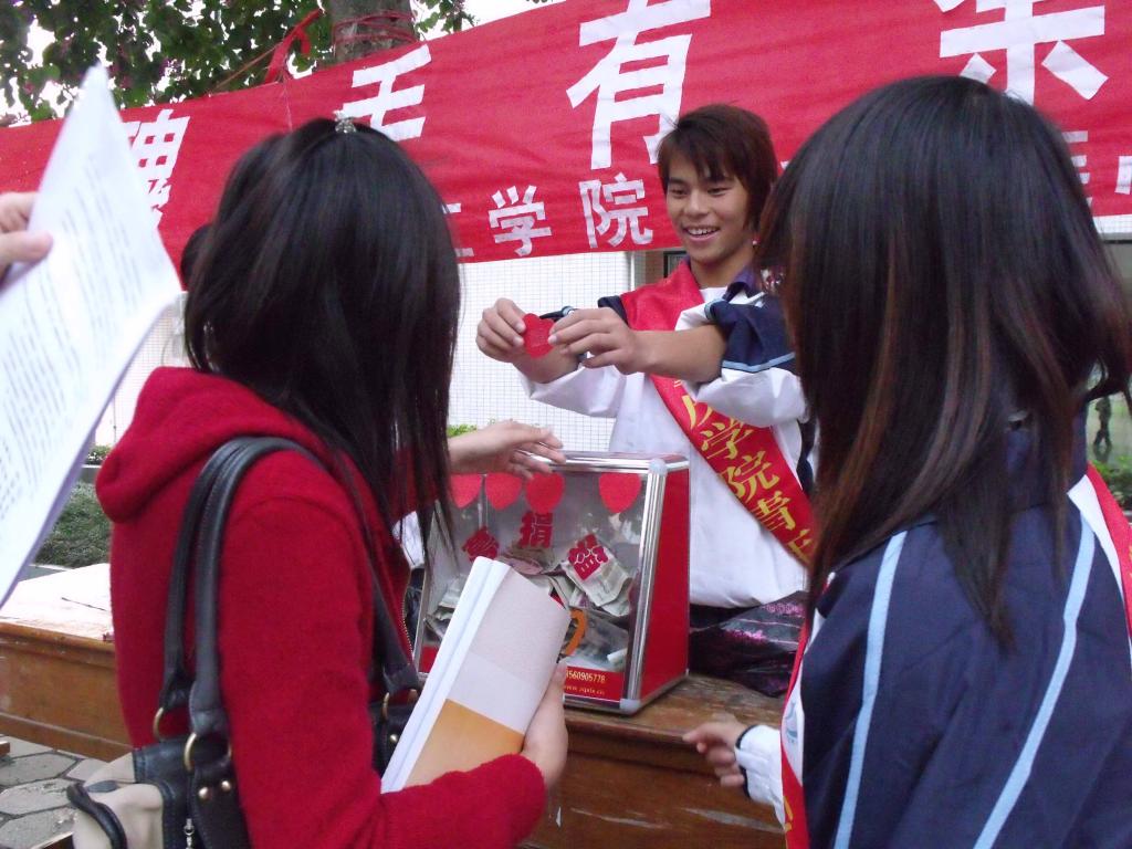 暖暖的阳光下,幽长的校道上,往来的人儿都停足于募捐箱前,向贫困生伸出关爱之手笑着把钱投进箱里,希望给贫困生送上一丝温暖。据在场的青年志愿者介绍,此次活动所得的善款将捐给心连心,以支助贫困生,帮助其完成学业。