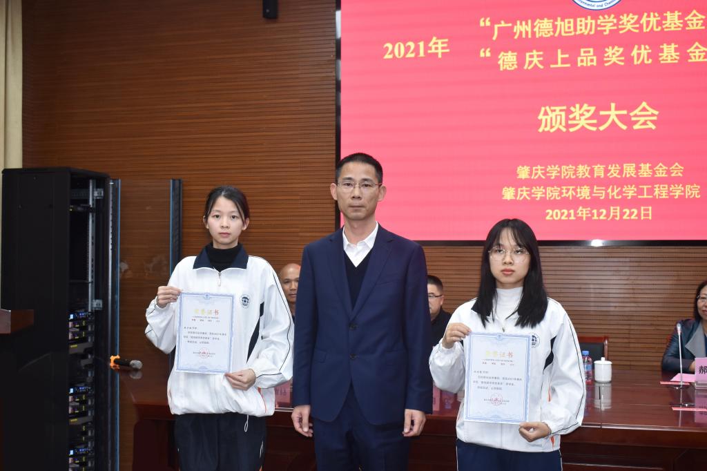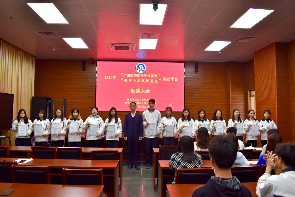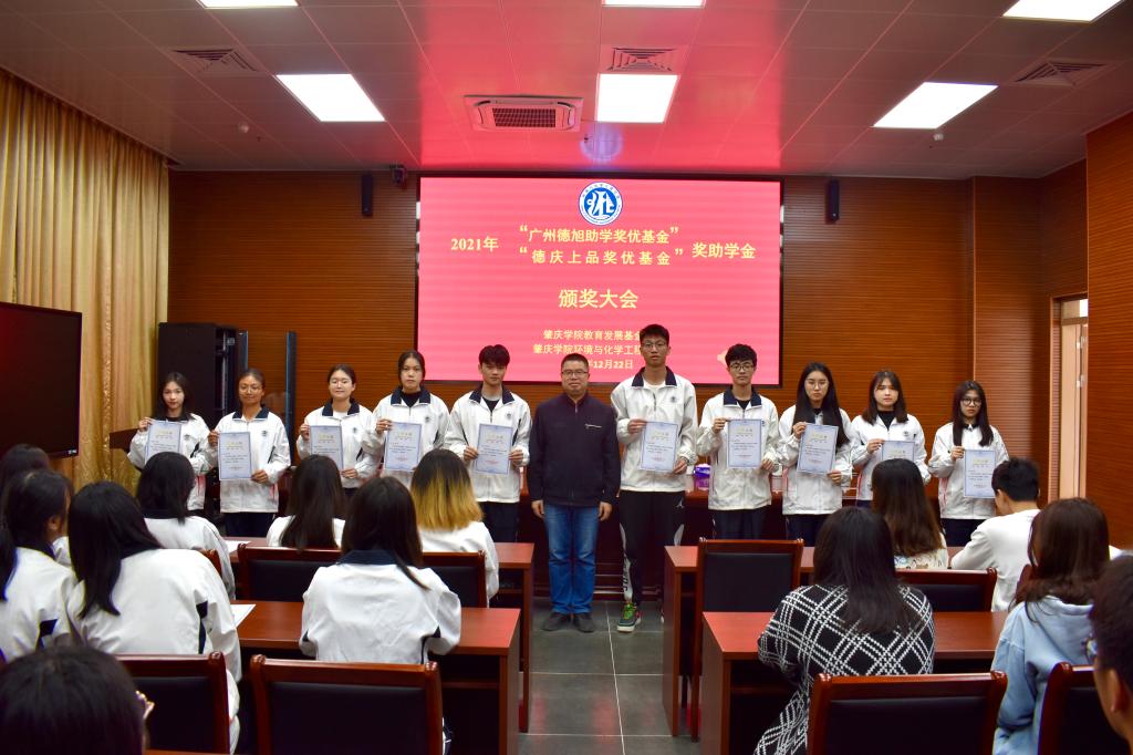 德旭新材料(广州)股份有限公司总经理何彦波先生为获得bevictor伟德官网 “2021年德旭精细化工专业励志奖学金”的同学颁奖