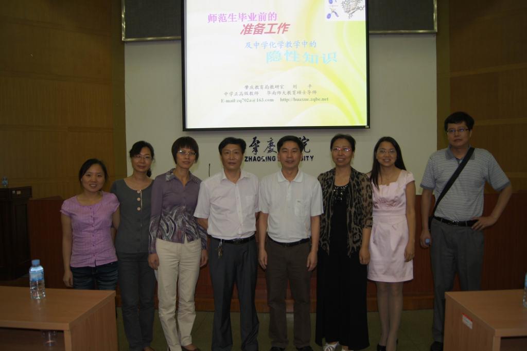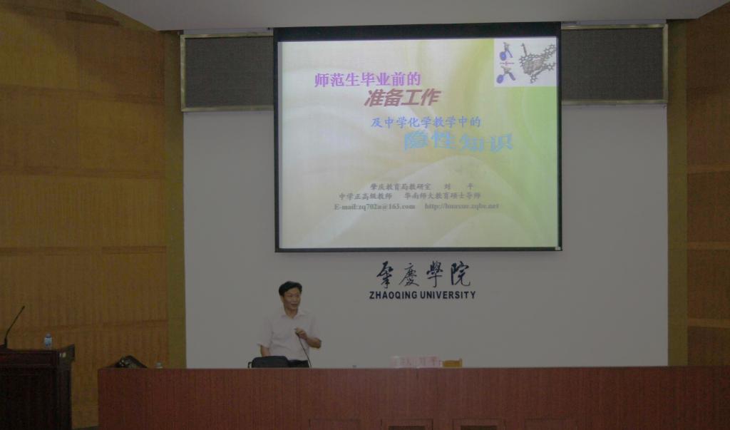 谈及到“中学化学教学中的隐性知识”时,刘老师从新课程理念出发,在“目的、内容、方法、习惯”四个方面演绎了隐性知识的重要性,同时告诉同学们要用情境创设模式、解决问题的思路展示等方面升华知识,还要从“教材、教材辅导书、优秀教师示范课、交流课、考试试题”等途径去挖掘隐性知识,并引用很多典型案例进一步表述隐性知识的重要。
